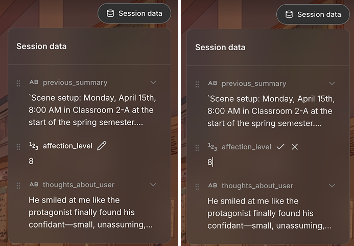 Live Updates: Values change in real-time as your flow's Data Nodes perform calculations and modifications during roleplay interactions.