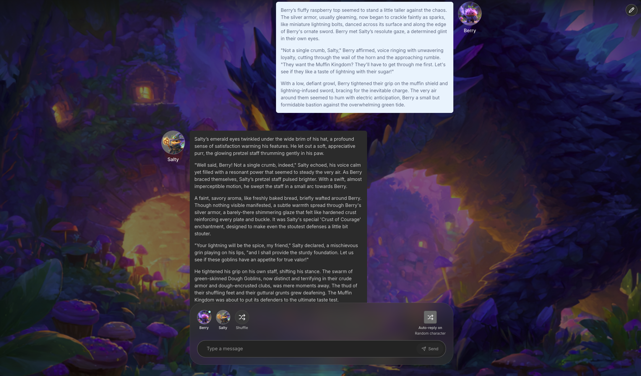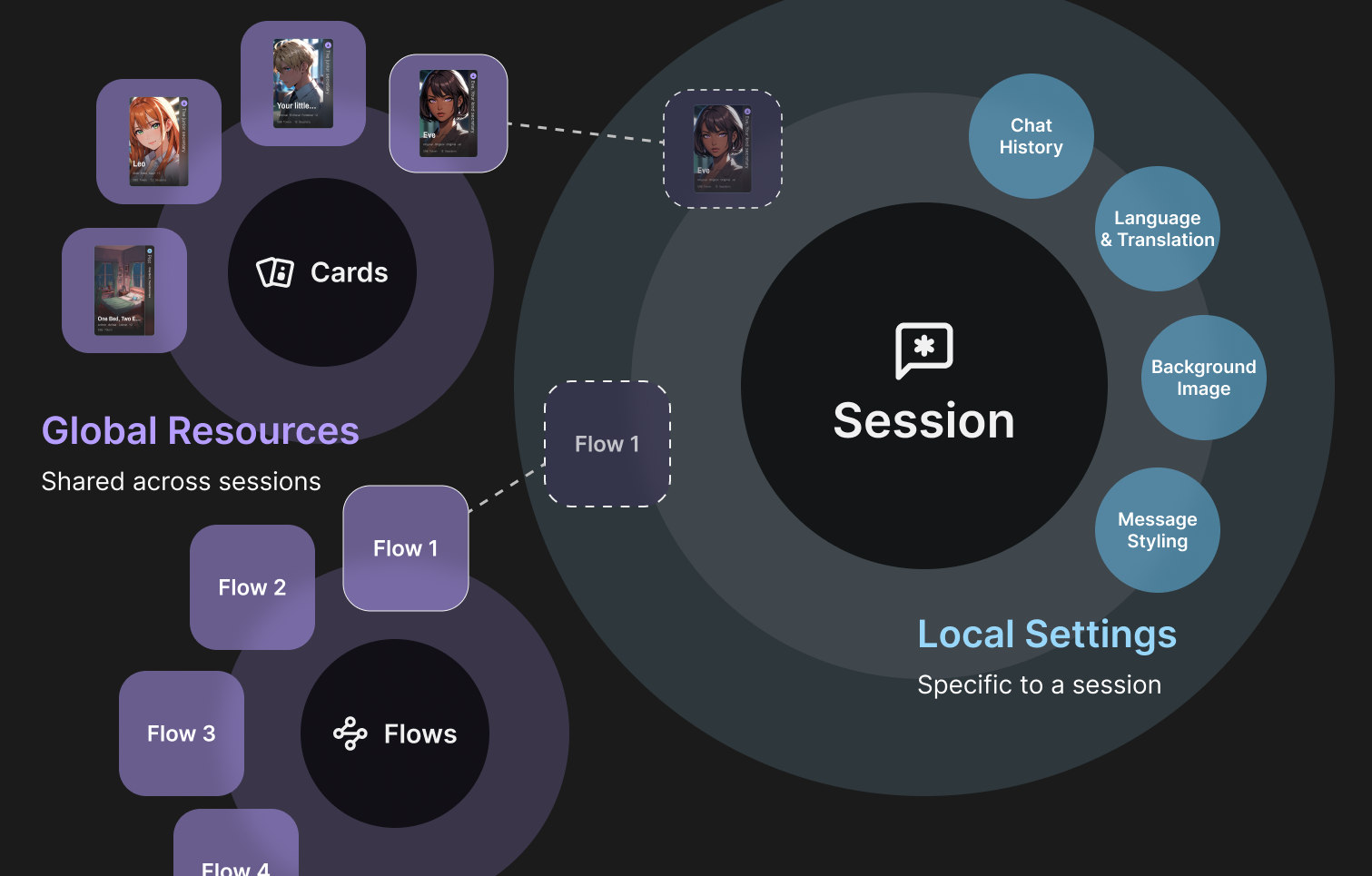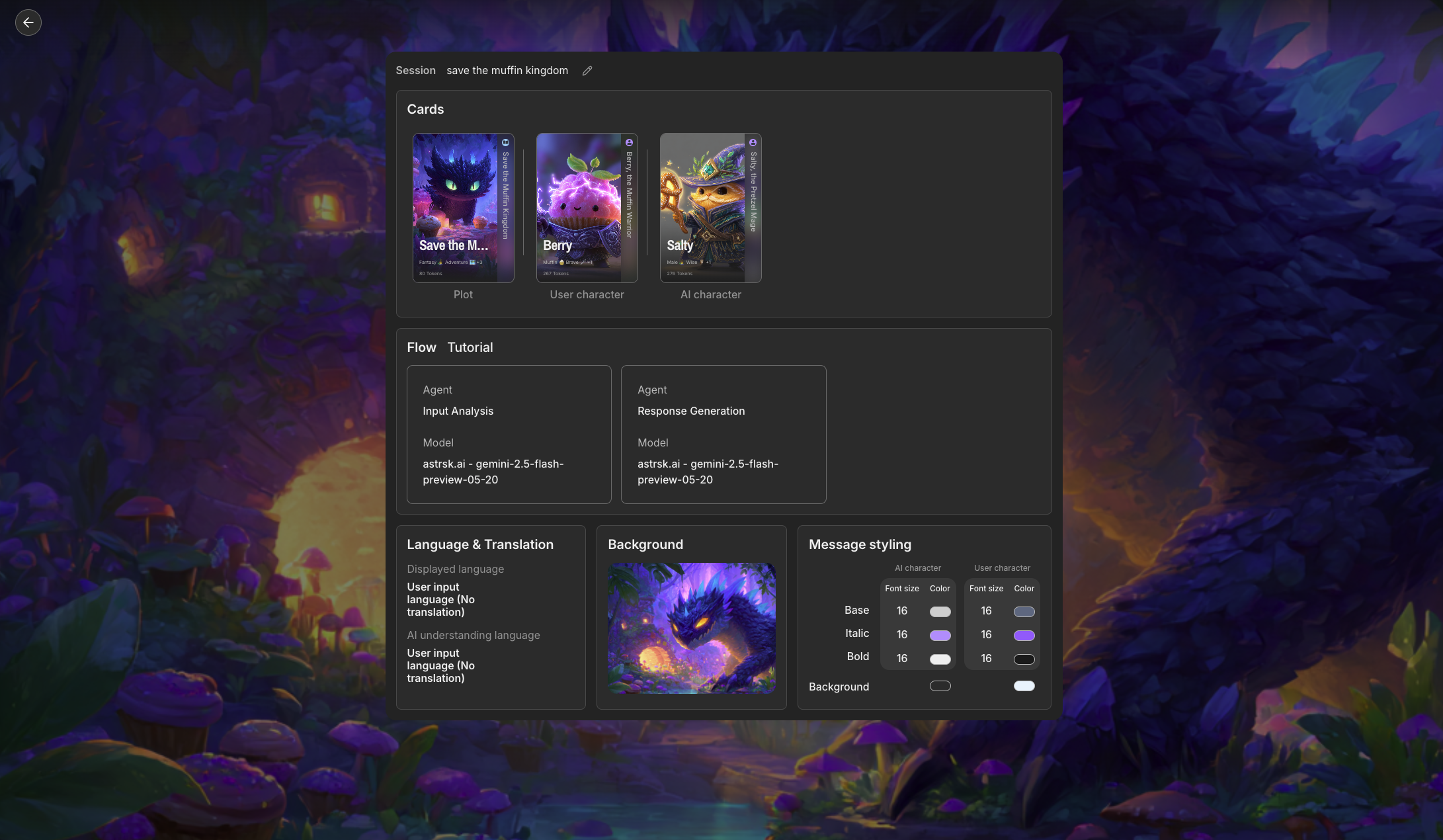 Along with the cards and flow which the user selects from their personal collection, the user can also set local settings (background image, chat styling, language, etc) to enrich the roleplaying experience.